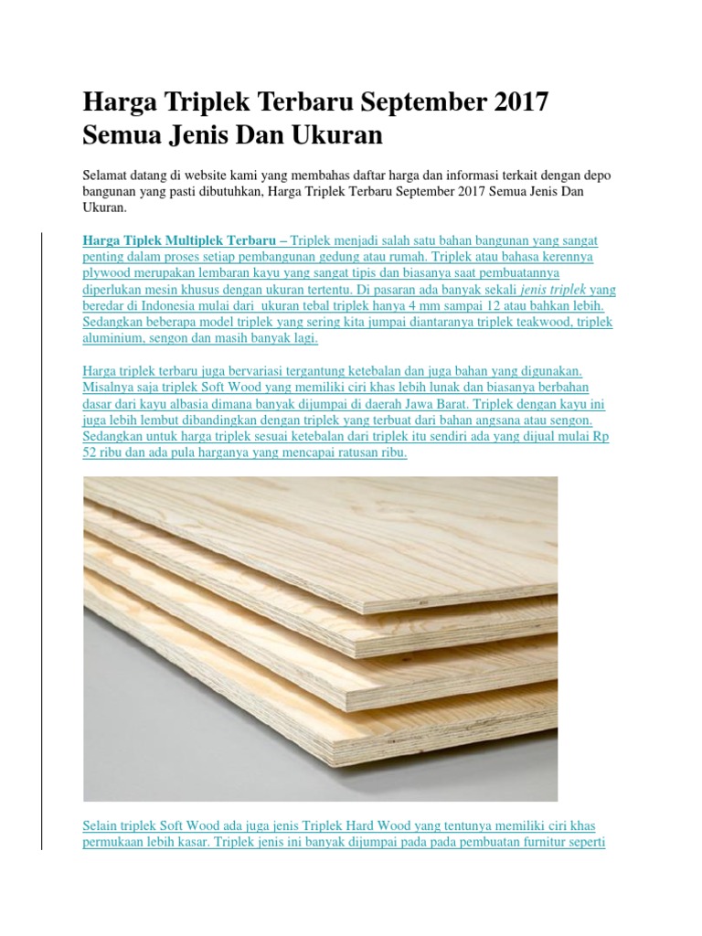 Harga papan triplek sendiri ditentukan berdasarkan jenis dan ukurannya. Sebelum menjelaskan tentang harga triplek, ada baiknya anda mengetahui terlebih dahulu tentang jenis triplek melamin memiliki permukaan yang halus dan licin. Sajian info harga bahan bangunan yang akan kami ulas kali ini akan mengangkat tema harga triplek terbaru untuk semua jenis triplek terbaik. Harga triplek 12 mm, kebanyakan dijual dengan bandrol yang tidak lebih murah dari multiplek yang berketebalan di bawah ukuran itu. Triplek atau disebut juga dengan nama plywood ini adalah.
